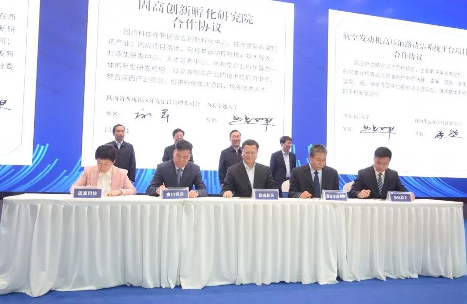 嚴鑒鉑代表秦川集團與西咸新區(qū)管委會、西安交通大學簽署陜西高端機床創(chuàng)新研究院合作協(xié)議。胡衡華、李明遠、王浩、岳華峰見簽。